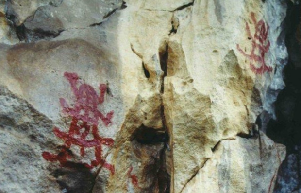 汽车下至大峡谷半腰后,便离开主干道转朝南,经木工村,再向谷底行驶两公里,到达牛角井村。村子附近,突有一处怪石嶙峋的山谷,壁画便藏在岩石中。壁画分为六处,分别在白岩脚和三面坡两地。白岩脚由一堵巨大的断壁得名。崖壁上,平行排着三处壁画。左面一处,画有人物、太阳以及一些莫名其妙的符号;一旁还有一则清道光十一年五月的“符咒”。壁画和符咒虽都为朱红色,但壁画颜色远比符咒陈旧。中间一处壁画,在距离近十米处。画面为六个似人非人,似兽非兽,形象怪异的图形,线条也较为粗壮。右面一处,当地人称之为曾家屋基,壁画为一只狗和几个不规则的符号。三面坡壁画较单一,分别为一个人物形象和一个怪异图形。人物形象,其面部眼、鼻、口可辩;而怪异图,却与白岩脚处如出一辙。