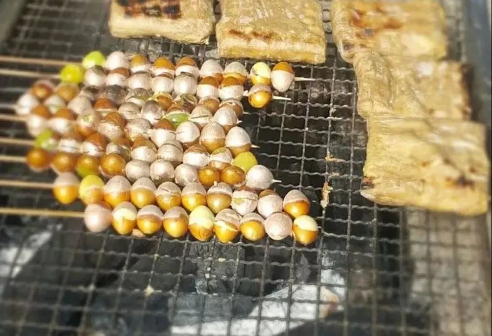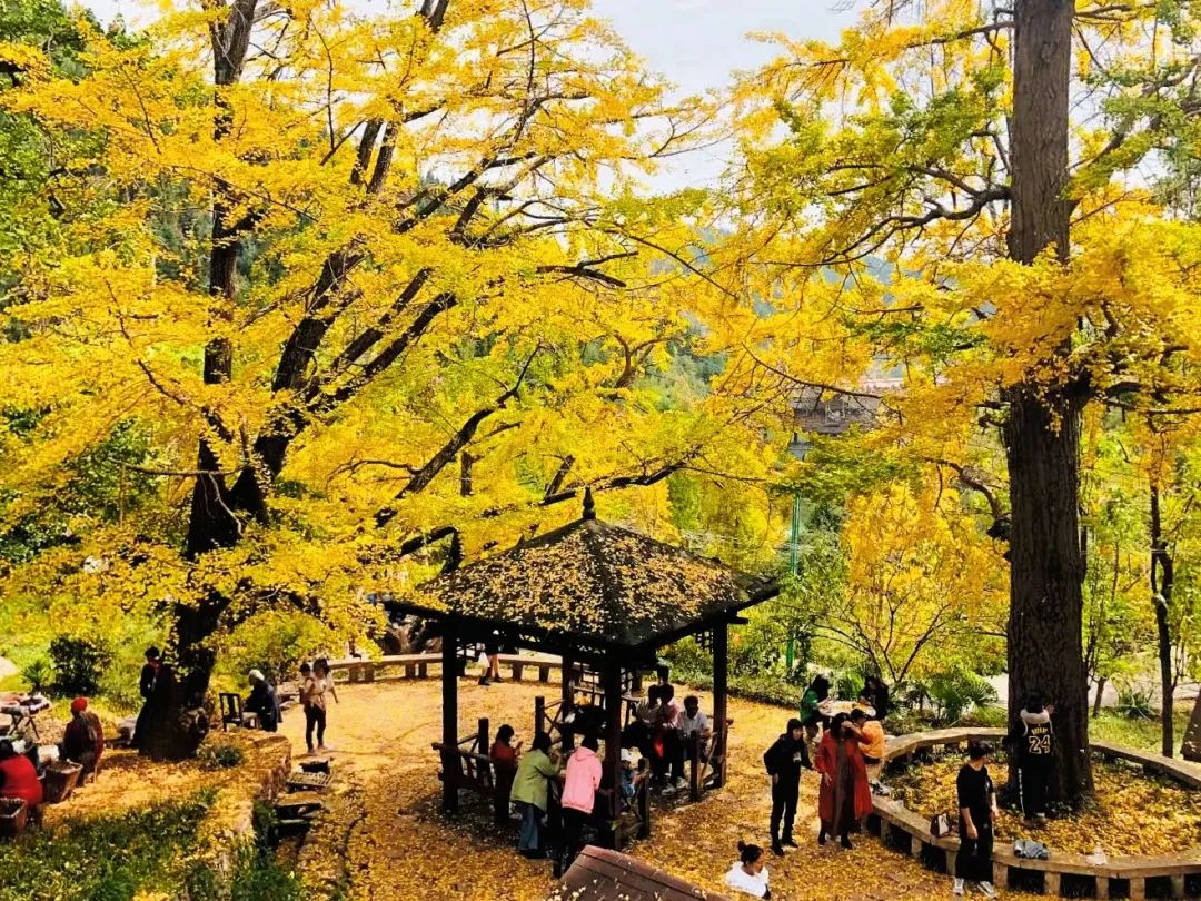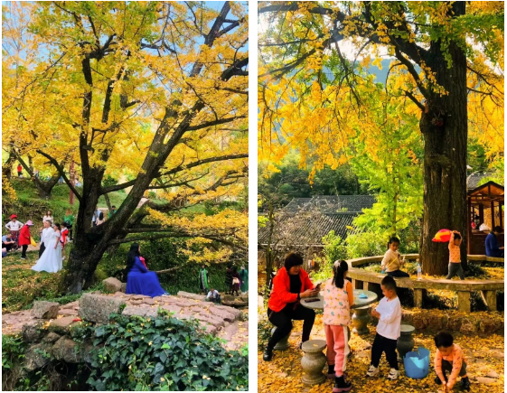 满树金黄,一地风光,玩累了可以随意在银杏树下小坐片刻,也可以吃上几串烤白果,那晶莹碧绿的新鲜果肉,不想尝都不行。更要尝尝当地的白果炖鸡汤,解解馋!