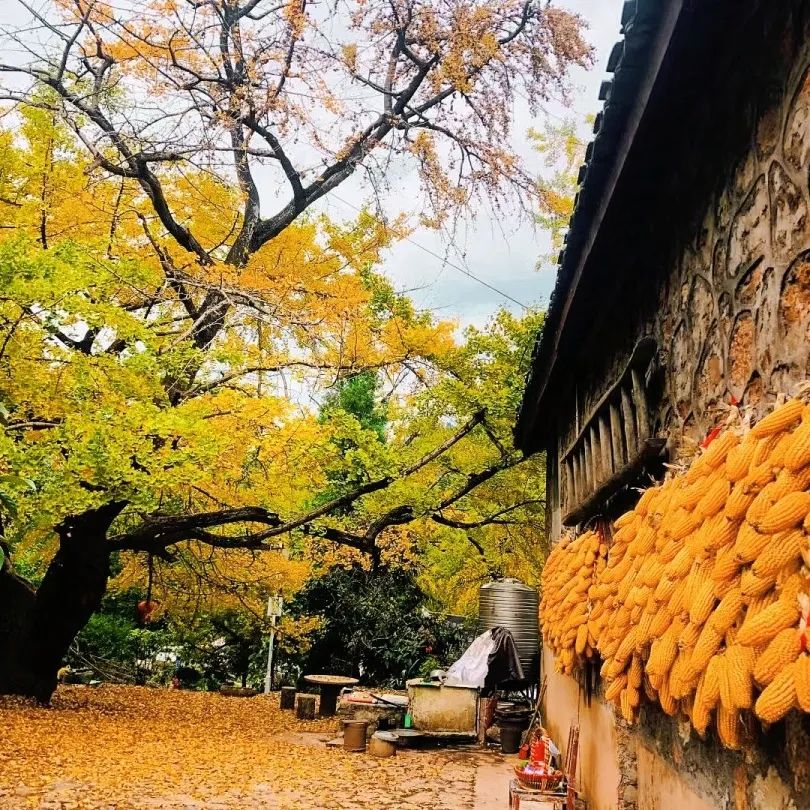 古树傍农舍,风吹铺满地,当房前屋后,田埂小巷、青瓦枝头,处处皆是一片金黄,天地间仿佛下了一场银杏雨,妥乐村就成了画中江湖。