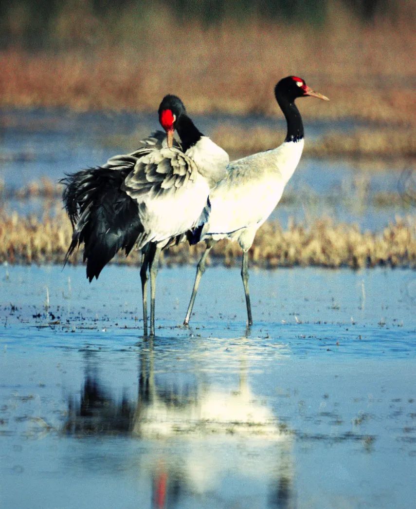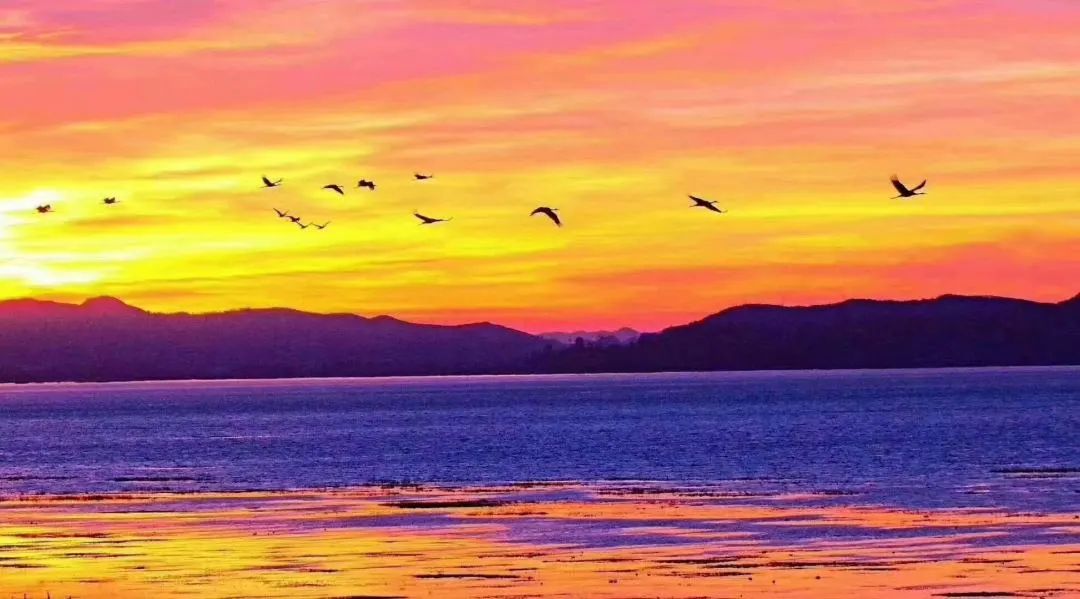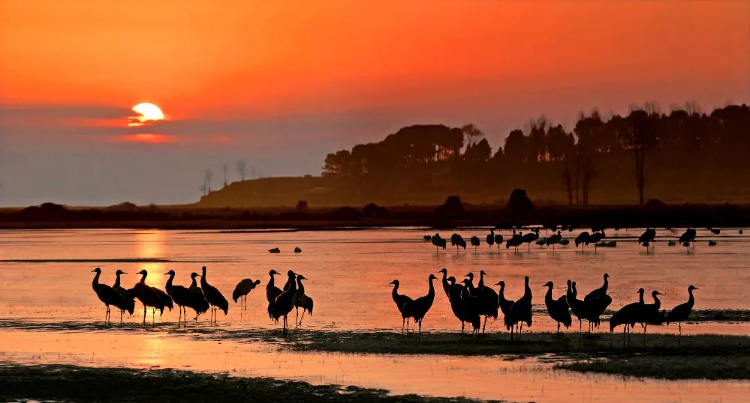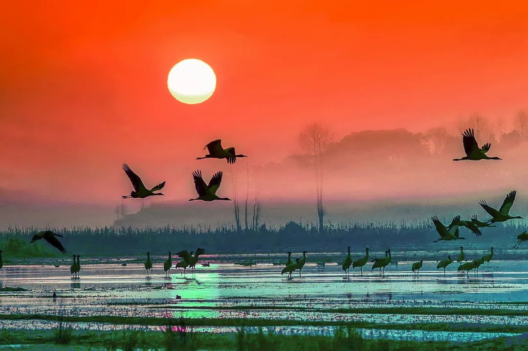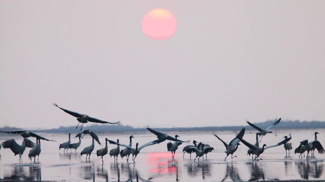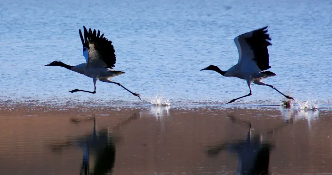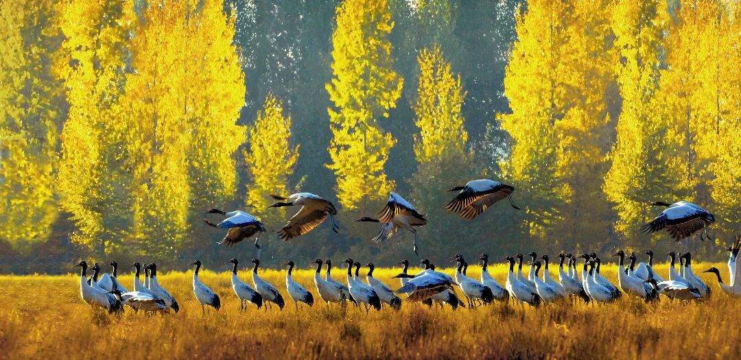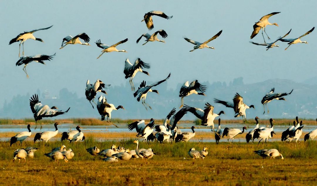 300余种候鸟到此安家落户,直到完成一轮生长季节才悄然离去,越冬期内鸟类总数可达10万只。其中最引人注目的应属珍稀迁徙候鸟黑颈鹤。