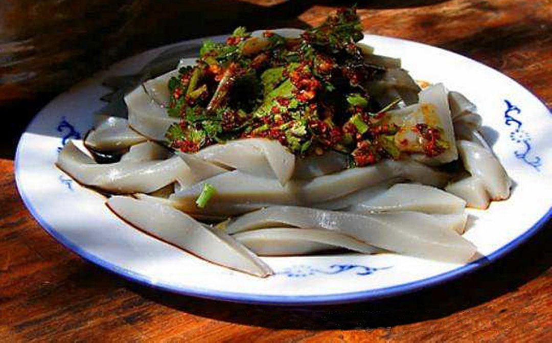 在威宁,凉粉是很普遍的小吃。街头巷尾,四季都有。常见的凉粉有三种,苦荞凉粉、豌豆凉粉和卷粉。