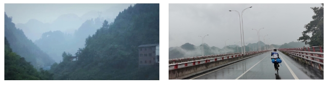 当来到海拔较高的黔西地区时,不论刮风下雨,我还是会和队友一起坚持在雨中骑行,直到完成每日的骑行目标。正如我在《大雨中行记》中写到:从织金追着暮晚过纳雍/中途所见皆是失魂落魄的雨/在对我的旅程大动干戈/每滴雨都带着灵感/在我的身体上写诗。