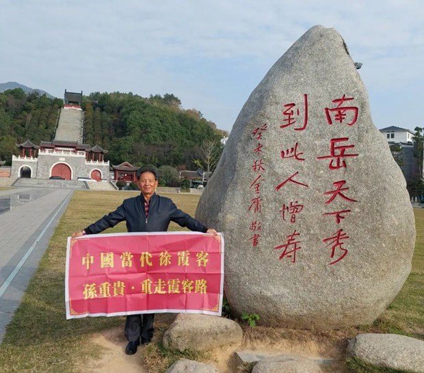 孙重贵:属实。人生在世,总是要有一点精神,我们的时代需要生生不息的行者精神。本人作为香港徐霞客学会会长,愿做一位徐霞客及学说的坚守者、研究者、宣传者和传承者。这次重走霞客路分二个阶段,我于2021年2月出发,开始第一阶段之旅,即行走霞客路中万里遐征的终止地云南以及广西、贵州。从转身处云南云县起步,走訪和考察凤庆、巍山、大理、洱源、剑川、丽江、祥云、姚安、大姚 、元谋、晋宁、昆明以及广西桂林、兴安,贵州贵阳、花溪、青岩、贵定、都匀、长顺、关岭等地,历经两个月,园满完成了行程约五千里的霞客云南、广西、贵州行踪。第二阶段计划为徐霞客开遊地宁海等地的中东部行踪,我于5月17日岀发,约五千里,目前已走訪和考察了浙江省的宁海、天台、雁荡、杭州、金华、兰溪、衢州等地,两项计划总计万里,故称为“香港徐霞客孙重贵万里遐征”。这一计划也正是我践行霞客精神的身体力行的体现。