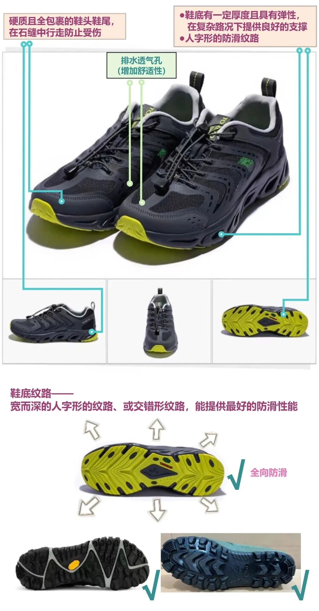 ● 合适的硬度,溯溪鞋若太薄,在行进时脚底常会感到疼痛。● 摩擦力大的橡胶鞋底+防滑纹路,防止涉水行走时滑倒。● 良好的排水性能,能够在涉水后快速排干水分。