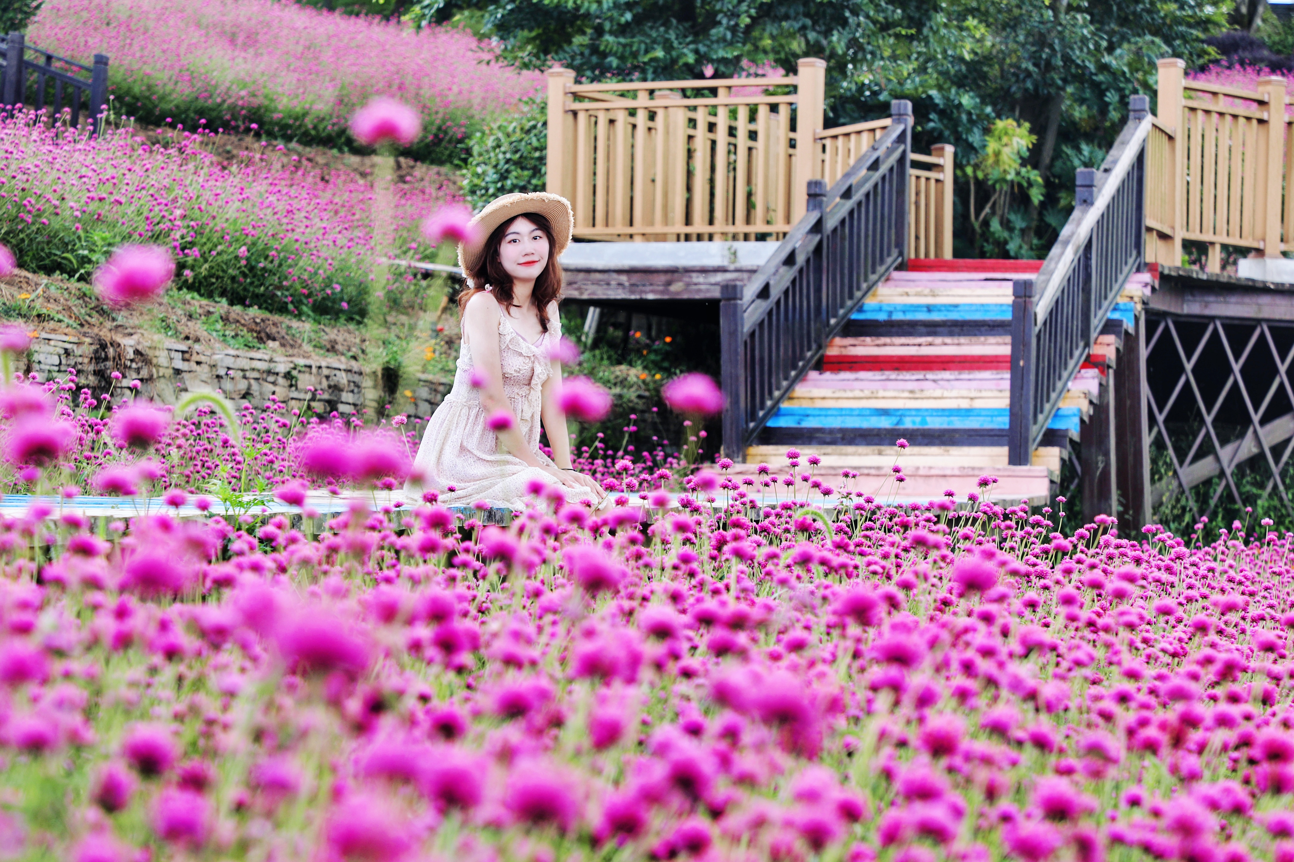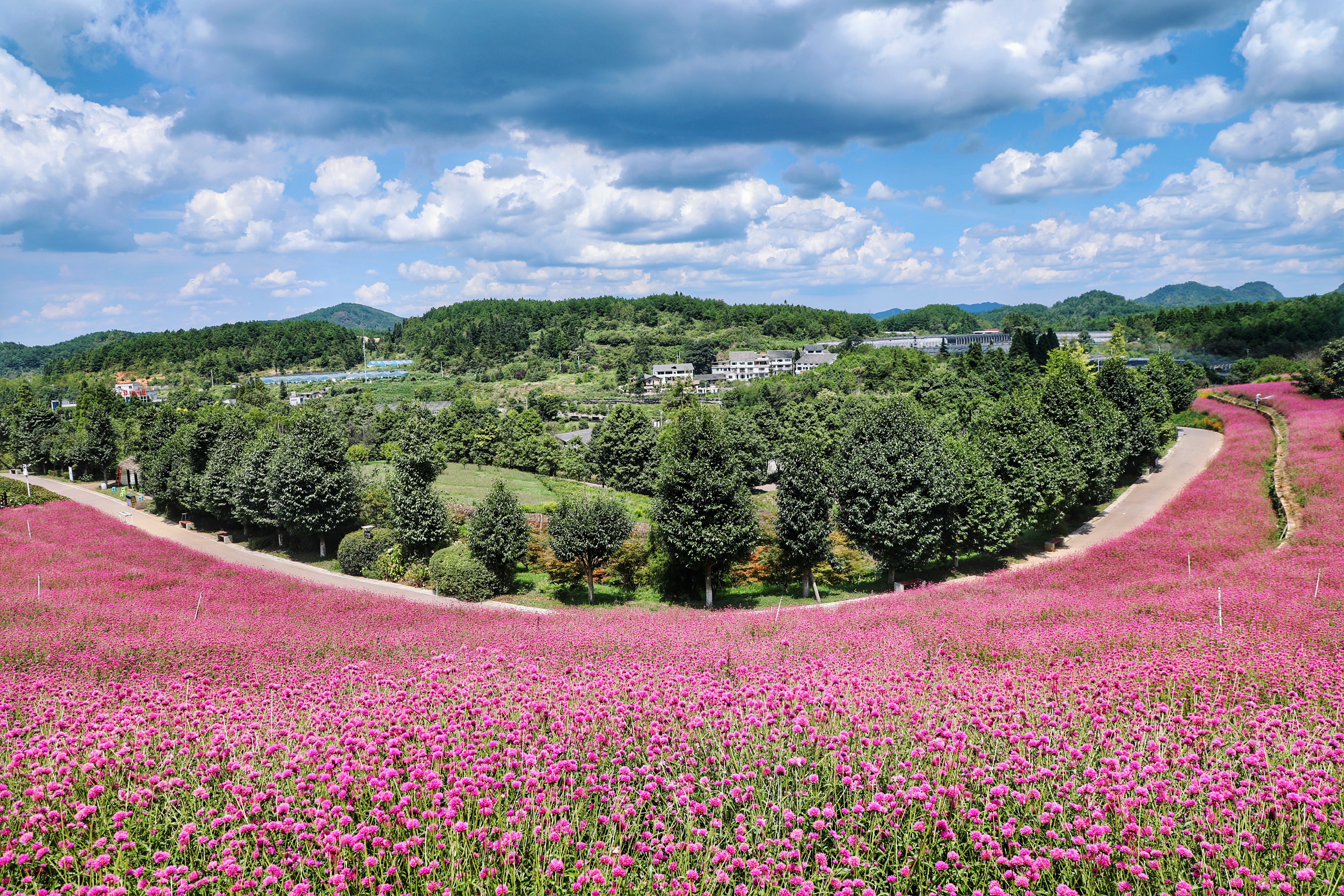 秋日时节,贵州省贵阳市乌当区花画小镇旅游景区里的千日红绽放,吸引市民游客前来赏花游玩。(摄影/王晓)