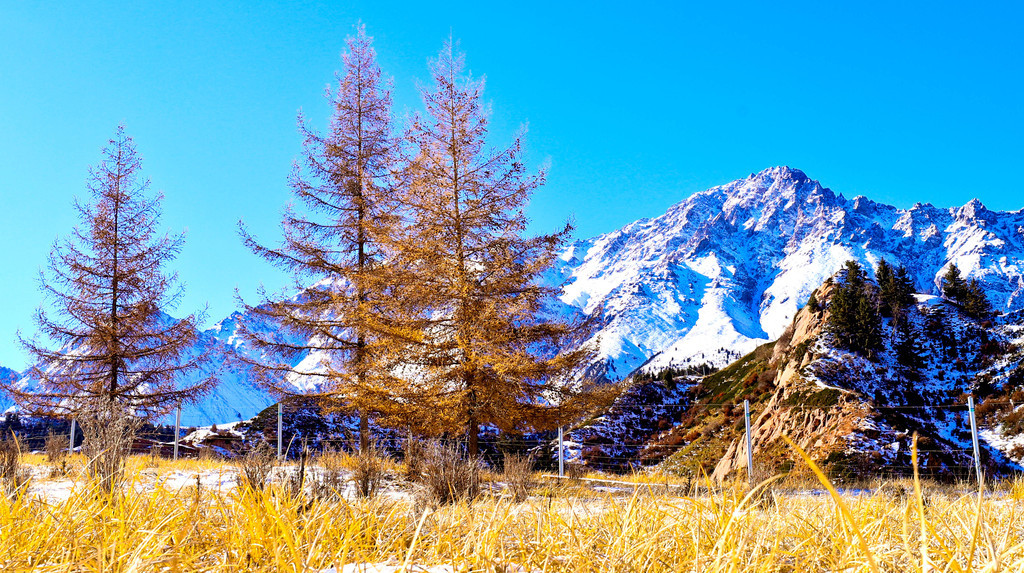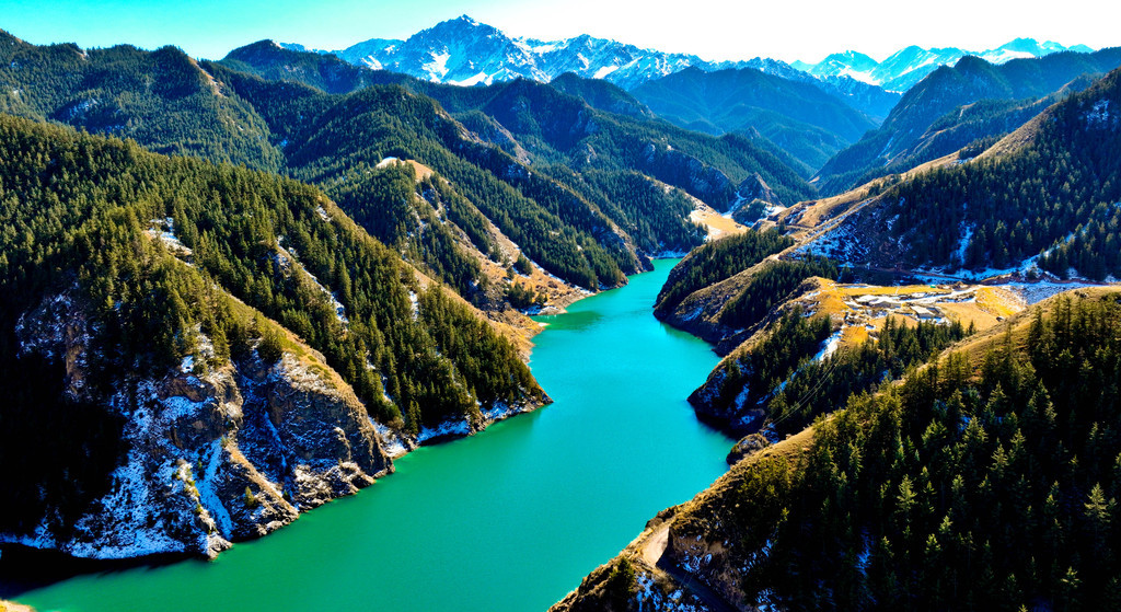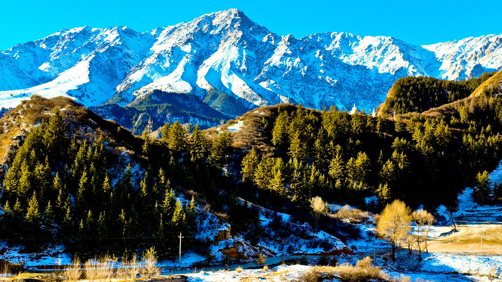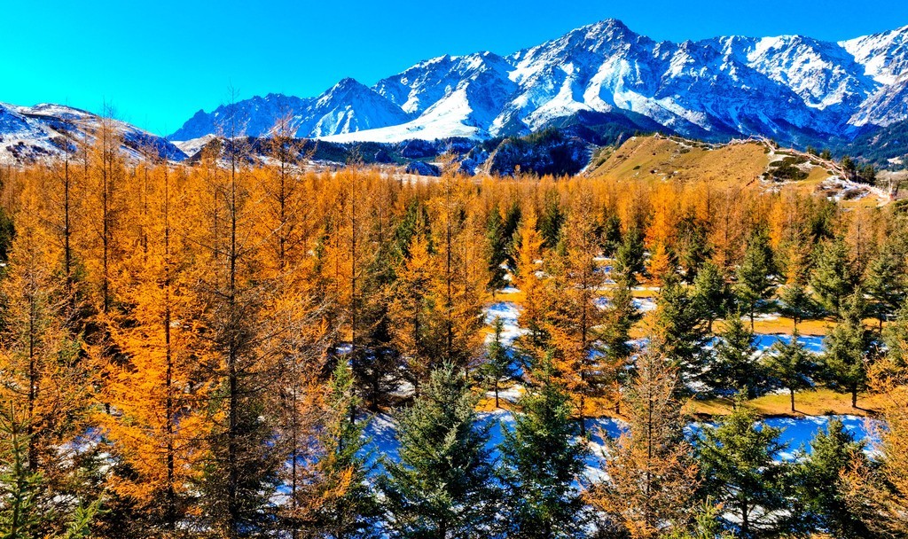 受冷空气侵袭,甘肃张掖迎来一场秋雪,大雪过后,祁连山山峰被白雪覆盖,巍峨壮美。蓝天下,红叶林、落叶松、白桦林,红白黄绿相映,格外耀眼,大地犹如铺上了金色的地毯、蜿蜒的黑河在峡谷中奔流而下,勾勒出一幅美丽的生态画卷。