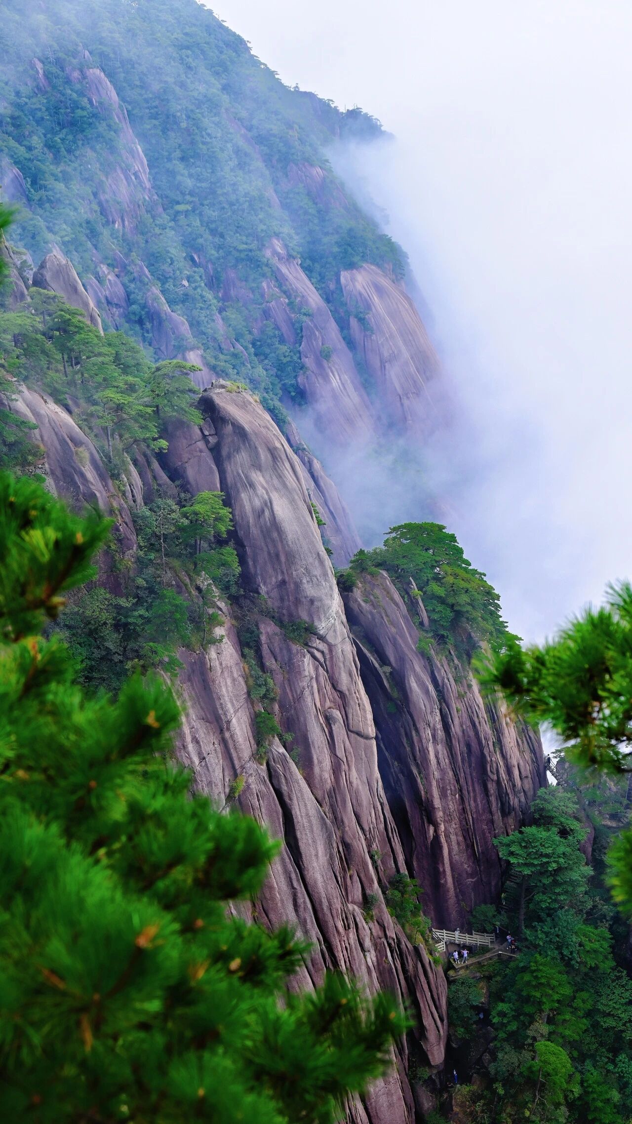 风裹着云海的水汽扑在人们的脸上,带着点沁人的凉意,抬头望去,天都峰顶还隐在云里,只露出半截灰色的岩壁,像被云雾轻轻攥在手里的簪子。此刻再看那岩壁上的花岗岩纹理,仿佛能看见亿万年岩浆冷却的痕迹,连松针晃动的节奏,都像是在和这片古老的岩石对话。