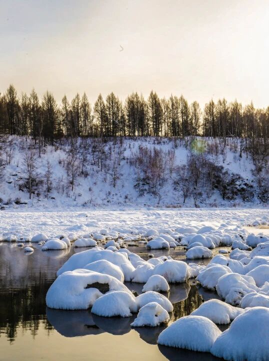 凛冬将至,呼伦贝尔大草原褪去了夏日的碧浪万顷,化作一望无际的雪原,寒风掠过,卷起雪沫纷飞,天地间只剩一片苍茫的白。老舍笔下的“天下第一曲水”莫尔格勒河,此刻也换上了银装,冰封的河面如一条蜿蜒的丝带铺展在雪原之上。夕阳西下时,河面细碎的冰晶被镀上一层暖橘色光晕,原本清冷的蓝冰瞬间变得温柔起来。