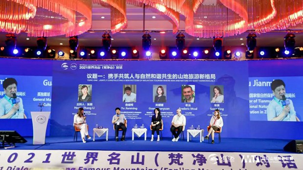 2021世界名山(梵净山)对话“议题一:携手共筑人与自然和谐共生的山地旅游新格局”环节,浙江天目山国家级自然保护区管理局局长俞建明、孤独星球(北京)文化发展有限公司总经理关媛媛、Xcity总裁老法(Frederic Moal)、朴语品牌创始人宋英等嘉宾在现场参与对话互动,深入探讨如何利用新理念、新科技、新模式推动山地旅游消费需求与供给创新,开发更多具有山地资源特色的优质生态旅游消费品,实现和谐共生、永续利用的的可持续发展目标。