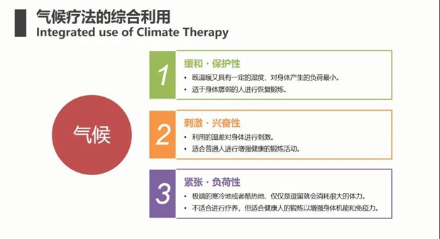 气候康养是什么?实际上是以有利于健康的自然气候条件为依托,以气候疗法为主要手段,辅以森林浴、阳光浴、温泉浴等自然疗法,并配套相关产品和服务,使人的身、心、灵得到有效改善的积极主动的健康活动。气象、地理、宇宙等因素都会决定特定气候的形成,也会对人体健康产生影响。比如宇宙因素,包括太阳射线、太阳风等,都与我们的健康息息相关。有的国家对山地气候分得很细,以意大利为例,从海拔0米至300米,一直到2500米,都进行了不同的分类不同的气候带有不同的康养价值和康养意义。