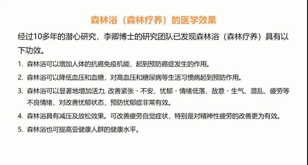最后要讲的是森林康养对人体的作用。这几年在全世界风行的森林康养和森林疗愈,实际上是来自于2009年日本发布的森林医学研究报告。森林浴+山地,气候康养+山地旅游与山地康养是一个融合发展的过程。李卿是日本东京大学的博士,斯坦福大学的博士后,他通过研究列举了森林浴对人体的五大好处(如下图所示) 。