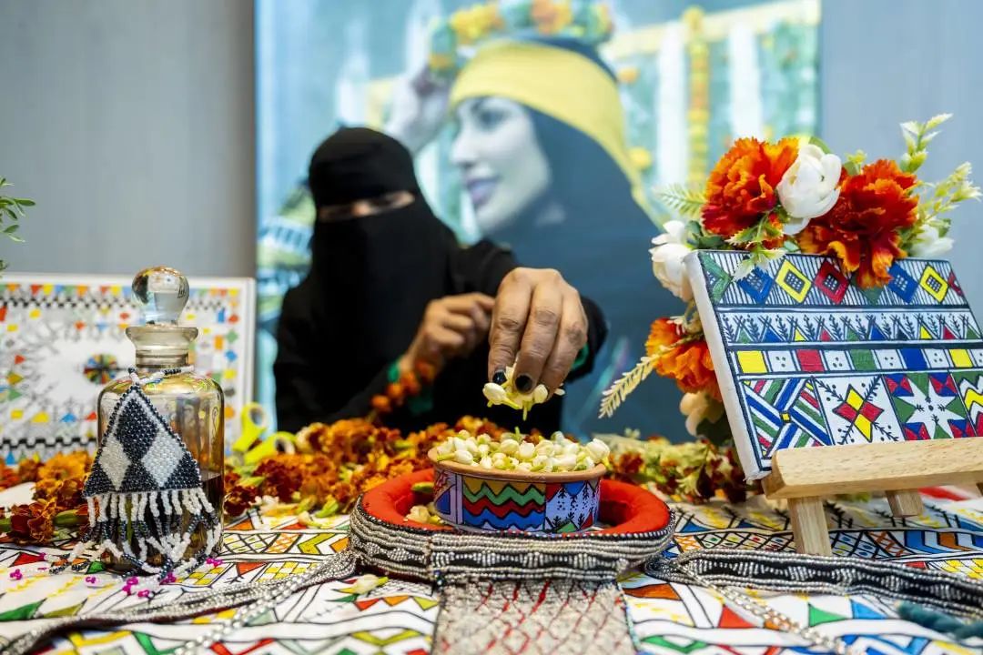 沙特馆文化元素满满:沙特咖啡、美食和鼓点奏乐,编织棕榈叶篮子,花娘用阿西尔地区(Asir)的鲜花编织花冠,“Bisht”制作人缝制传统斗篷,书法艺人用隽秀飘逸的阿拉伯文字撰写客人名。