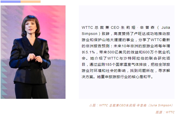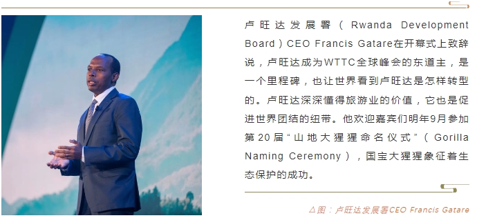 本届峰会WTTC新任主席Greg O’hara,是拥有107亿美元资产的投资公司Certares的CEO。他说旅游投资不仅是经济帐,也是社会责任。卢旺达的旅游业日新月异,观赏大猩猩的许可证费用,相当一部分返回给当地社区。有了收入和工作,人们不再捕杀,而是种植树林,保护生态,为卢旺达带来了长远利益。这样的投资是对社区负责的。
