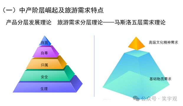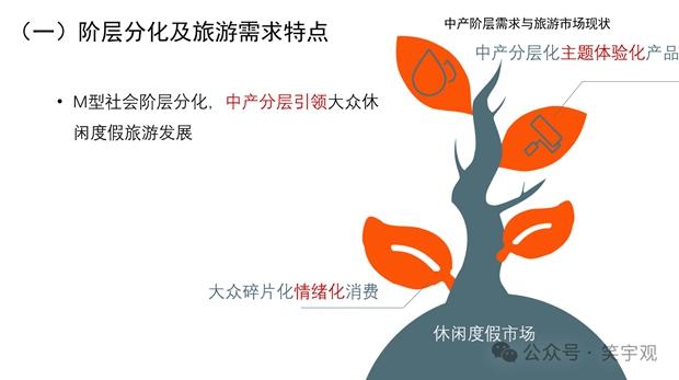 根据先发地区的文旅市场发展历程,中产分层化引领主题体验产品方向,大众情绪化消费跟随其后已是必然规律。而由中产分层引领的主题细分休闲体验消费,必将是中国未来旅游发展的一个必然的趋势。中国4亿中等收入群体、将近2亿中产阶层,目前正在发生分化,即大众阶层碎片化、情绪化消费;中产阶层追求性价比与主题产品、服务的体验内容,进而导致了消费需求多元、细化,随之倒逼产品分层、细化开发。