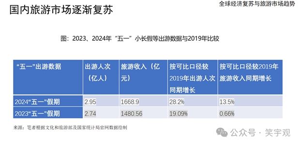 但是,国内情况正好相反。虽然今年的旅游出行数据虽然向好,但是旅游消费情况并不乐观,背后的原因既有消费降级,也有供需错配等诸多因素。复盘2024年、2023年“五一”小长假的消费数据不难看出:同比2019年,2023年出游人次增长19%,2024年增长了28%,但是旅游收入仅增长了不到一半。也就是说,旺丁不旺财的现象比较显著。