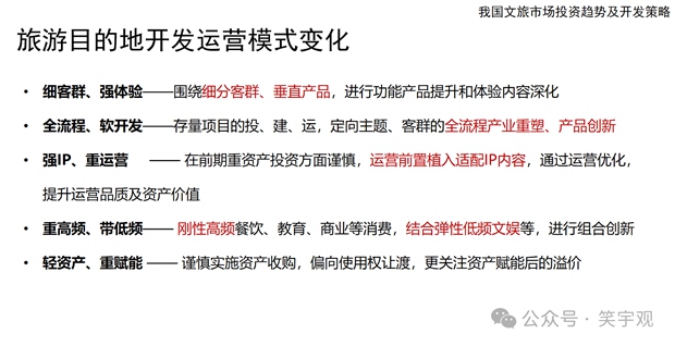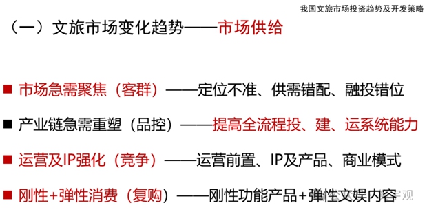 第一,是融投一体化,即LP的GP化,包括投资管理前移。第二,是投资的可经营性资产与非经营性资产分离。第三,轻重资产配置。我们现在都讲重资产模型、轻资产拓展,这是没错的,但是未来小体量打造重资产模型、轻资产再拓展将成为新的趋势。第四,投资标的。文旅IP、能够落地的品牌、供应链、投资运营团队、优质资产、半成熟项目都将成为未来投资标的。