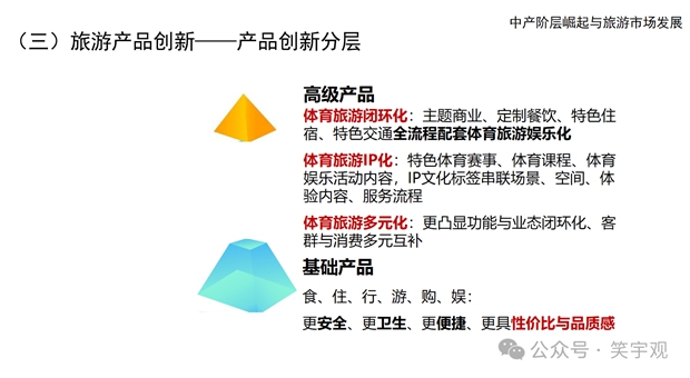 在体育旅游产品创新上,基础型产品在关注吃住行游购娱六要素的安全、卫生和便捷、性价比与品质感的基础上,也更关注高级型体验内容的体育旅游产品消费闭环化(注重全流程体育旅游消费闭环)、体育旅游IP化(要从参与者付费、赞助商付费,向衍生IP产品付费、市场消费者付费转型)、业态多元化(多业态互补、多客群、多层次消费)。因此,基础功能型产品品质过硬、性价比优,主题体验内容多元、体验产品细化将成为发展趋势。