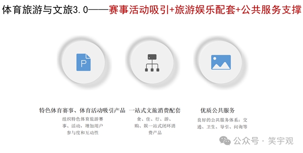 同时,体育旅游目的地化将是大趋势,必将注重产品分层优化、体验场景塑造、服务目标引领及消费闭环打造。最后,体育旅游目的地需要核心三要素:即特色赛事活动吸引人群,优质的主题旅游娱乐配套引导消费,良好的公共服务支撑,进而形成良好的口碑传播,逐渐形成文体旅特色目的地。