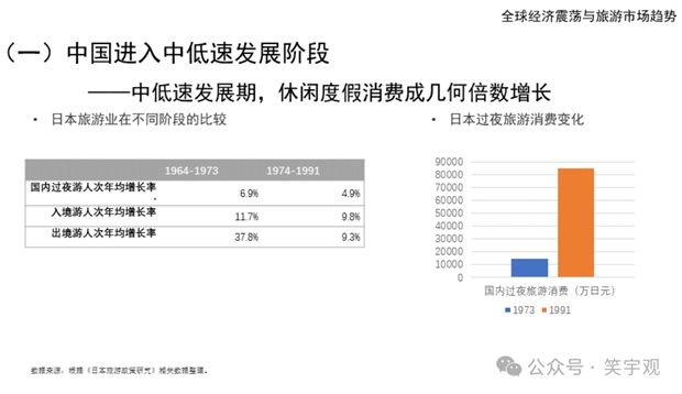步入后高速发展期后,日本旅游业发生了什么变化?在中低速增长期,日本过夜旅游人次,也就是休闲度假的消费,虽然人次增速降低了,但是根据《日本旅游政策白皮书》数据显示,日本过夜旅游总消费在1973年低速期和1990年高速期差距是2.7倍,中低速期休闲度假消费成几何倍数增长。这说明了在工业化中后期向后工业化转型的时候,生产型的商品经济社会正在向后工业体验经济消费型社会转变,在转变过程中的体验消费包括高质量产品的创造、高质量消费已经发生了很大的结构性变化。