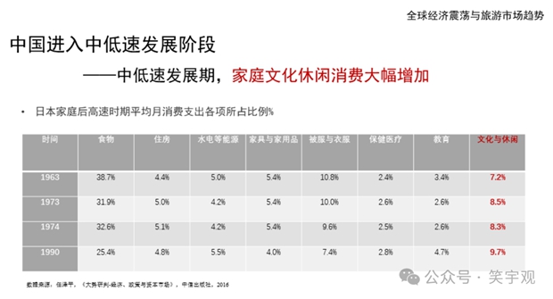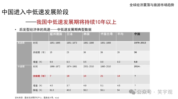 如(上)图所示的国际经验,联邦德国、日本、韩国和中国台湾地区进入后高速中速发展期,其GDP增速下降,平均GDP增速是4.5%,平均持续时间是14年。据此预测,我国中低速发展期将持续15年左右。那么,中低速发展时期中国文旅市场会发生什么变化?