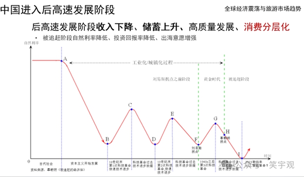 如(上)图所示的国际经验,随着全要素生产率、投资回报率、自然利率等走低,中国自2022年起,已经进入被追赶阶段即后高速发展阶段。美国70年代、日本90年代中后期都曾经历这一阶段。其特点就是,因为国内企业面临内卷和低回报率,出海寻求机会。市场就业岗位收缩导致收入预期不乐观,收入下降、储蓄率上升,进而影响非刚性消费。但是,在这一阶段,小额、碎片化的休闲文旅娱乐消费呈上升态势,这从美国同一阶段的电影业发展、日本同期的游戏机业务火爆能一窥端倪。