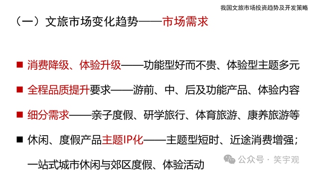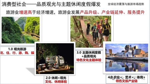 第一阶段,是刚刚开放的旅游市场以观光旅游为主,包括吃、住、行、游、购、娱六要素;第二阶段,以都市休闲、乡村微度假和观光产品文化休闲体验为主;第三阶段,也就是我国正在经历的阶段,即体育旅游等多元主题休闲度假和品质观光旅游为主,主打特色文化主题体验,是目前我国正在转型的阶段;第四阶段,是“+文旅”的产业链协同发展阶段。