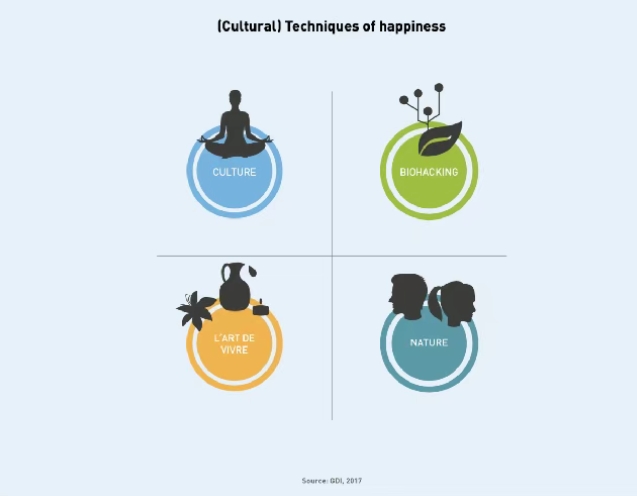 全球康养研究院发布的《2030康养报告》聚焦幸福新范式。如图所示,“自然”是实现幸福的四大途径之一。自然是山地旅游的核心元素,因此与康养和健康的联系是显而易见的。报告展示的另外三大途径分别是文化、生物黑客,以及报告作者所谓的“生活艺术”(针对本次会议而言,亦可将其定义为一种精致的休闲方式)。