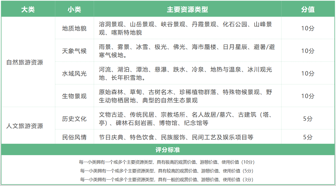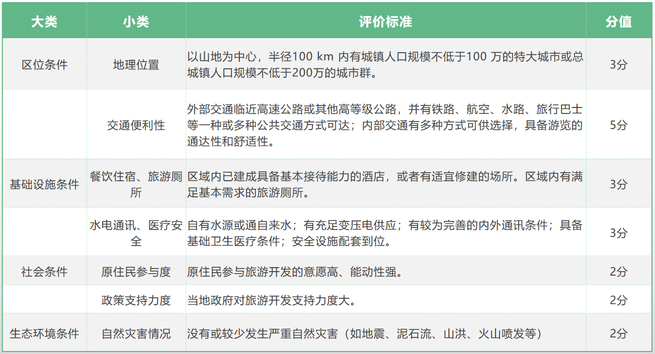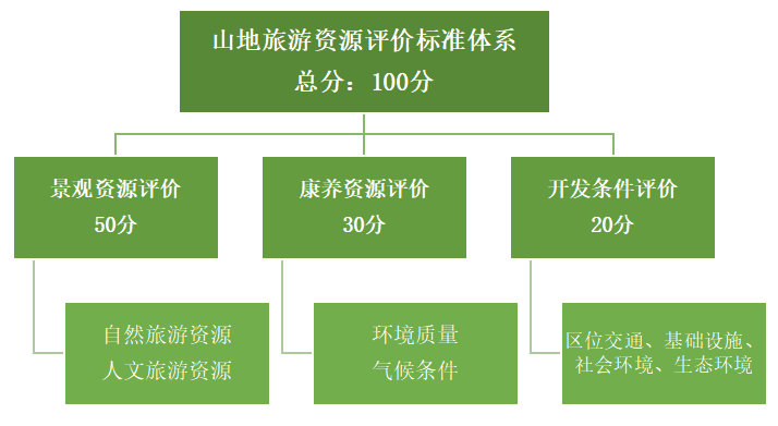 根据全球山地旅游开发的实践经验,以及各国和国际组织的旅游资源分类标准,我们提出山地旅游资源评价标准体系。该体系针对山地旅游资源的核心内容加以细化分解,从景观资源、康养资源和开发条件三大方面进行综合评价。