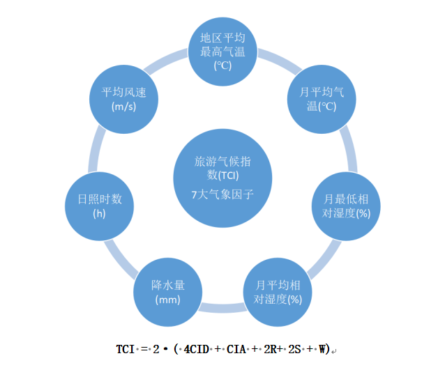 加拿大学者米克茨克斯基提出的旅游气候指数 (Tourism Climate Index, TCI) ,方法主要由7个气象因子计算得到:即地区平均最高气温(&4u:2103) 、月平均气温(&4u:2103) 、月最低相对湿度(%) 、月平均相对湿度(%) 、降水量(mm) 、日照时数(h) 、平均风速(m/s)。其计算公式为: TCI = 2·( 4CID + CIA + 2R+ 2S + W)。其中,CID 为白天舒适度,由平均最高气温(&4u:2103) 、月最低相对湿度(%) 构成;CIA 为日均舒适度,由月平均气温(&4u:2103) 、月平均相对湿度(%) 构成;R为降水(mm) ;S为日照时数( h) ;W为平均风速(m/s) 。不同指标,权重不同。各个气象因子根据各自的赋分标准进行赋分,最后综合计算得出旅游气候指数,将旅游气候舒适度分为四种等级:当TCI < 40 时,旅游气候舒适度为“不适宜的”;当TCI 在40 ~ 60 之间气候舒适度为“可接受的”;TCI 在60 ~ 80 之间,气候舒适度为“好的和非常好的”;TCI > 80,气候舒适度为“极好的”。一般来说,气候舒适度能达到60分以上的山地,才有条件开展康养活动。