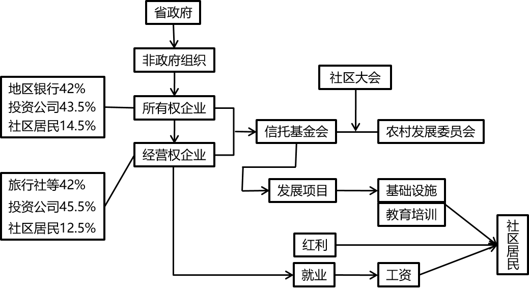 公园相关的企业分为所有权和经营权两种属性。专业旅游投资公司作为两类企业的第一大股东,但不具有控股权,以限制其出于逐利目的的盲目开发;地区银行和旅行社分别作为两类企业的第二大股东,间接代表原住社区的利益;社区居民则少量参股,持有旅馆所有权和经营权的双重股份,以增加直接收益渠道;设立社区大会及信托基金会和农村发展委员会,规范旅游收益的分配与使用。