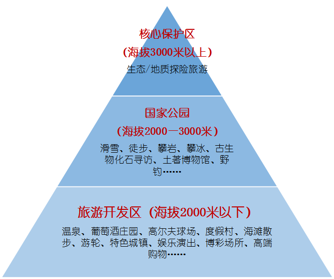 ·产品体系构建:根据用地控制级别,巴塔哥尼亚地区构建出完善有致的度假产品体系。随着海拔的降低,人员密度增大,活动强度降低,活动形式更具游乐性,针对性满足专业、高端和大众客群需求。
