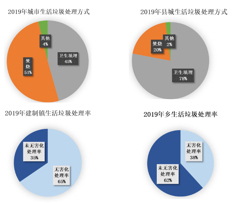 全国生活垃圾处理率大幅提高,城市和县城的处理率接近100%,但填埋和焚烧还是主要处理方式:2019年,生活垃圾填埋率城市为45%,县城达78%;生活垃圾焚烧率城市为51%,县城为20%。而以回收有机物质和能源为目的的生化处理方式,还不到5%。然而,乡镇与城市差距很大,情况仍很严峻:在镇级建成区,35%的生活垃圾未经正规处理,乡村则为62%。由于缺乏统计,没有具体的处理方式数据。但了解农村的人知道,虽然我国各地农村市政建设水平差距很大,但生活垃圾随意掩埋、露天燃烧的情况仍很常见。