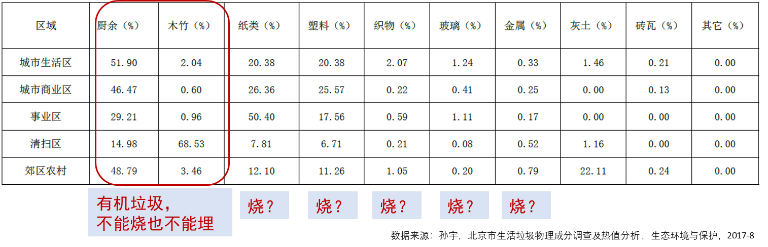 由于生活垃圾填埋的巨大问题,各地快速建设垃圾焚烧厂,焚烧率快速增加。焚烧厂安全运行的温度需达到850度以上,才可使排放的烟气中不含呋喃、二噁英等危险物质。如果进厂垃圾是未分类的混合物,则有一半是有机物质(厨余为主),其物理特性是热值低、水分高,若直接焚烧,需添加助燃剂才可达到850度以上的高温。加上除尘、炉渣稳定化处理等,使焚烧厂运营成本极高,仅靠焚烧发电的收益很难平衡。各地政府为保证焚烧厂安全规范运行的同时又不亏本,提供了高额补贴,这已成为很多焚烧厂的利润来源。从2019年开始,46个试点城市陆续强制分类生活垃圾,让很多人认识到垃圾分类后再分别处理的意义,对降低焚烧厂的运营成本是好消息,但现有焚烧厂的处理能力却面临过剩的问题。如果我们仔细考察城市生活垃圾的成分,以表1北京市生活垃圾平均组分为例,就会发现生活垃圾中几乎没有适合直接焚烧和填埋的成分。中国城市生活垃圾平均51%的焚烧率,显然过高了。