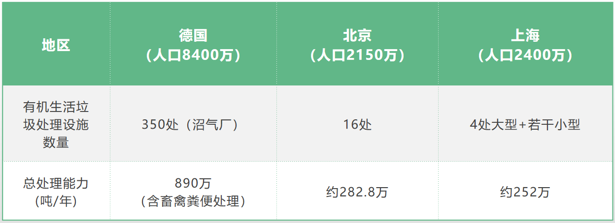 数据来源:德国沼气联盟German Biogas Association(2019年),北京城管委(2020年),中国人大网(2019年)。北京与上海年处理能力为根据日处理能力估算。