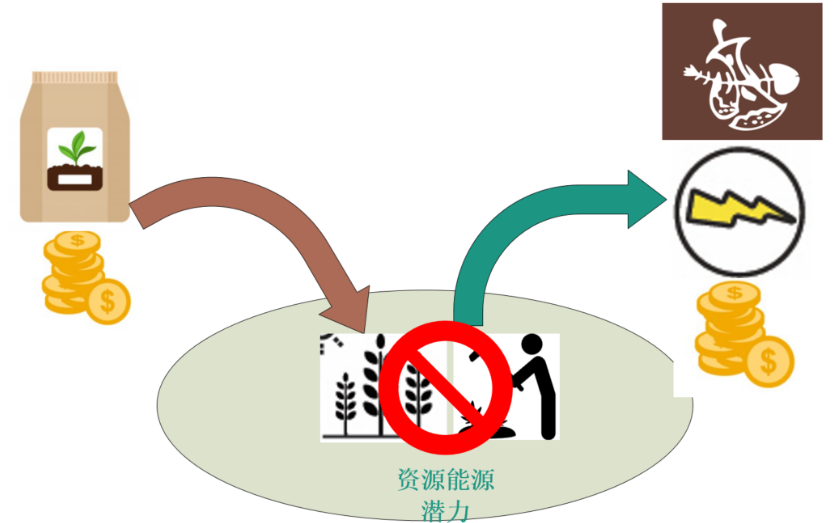 图5是村镇地区这种“获取资源(有机物质)→生产农产品→丢弃有机垃圾”的线性经济的示意图。把垃圾外运处理,看起来解决了麻烦,实际是送走了资源。