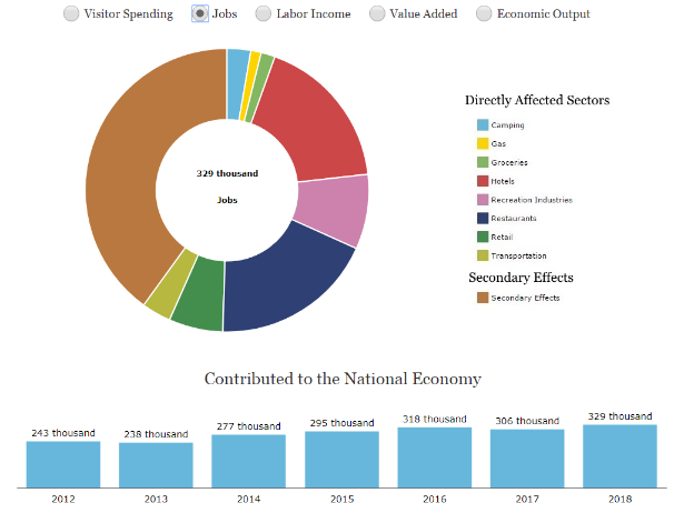 从2012年到2018年,美国国家公园在游客消费、就业、劳动收入、附加值、国民经济产出等方面都保持了逐年增长的态势。2018年,3.18亿人次游客参观了位于美国各地的国家公园,共计花费约202亿美元。这些旅游收入支持了32.9万个就业岗位,实现了136亿美元的劳动收入、234亿美元的附加价值和401亿美元的国民经济产出。