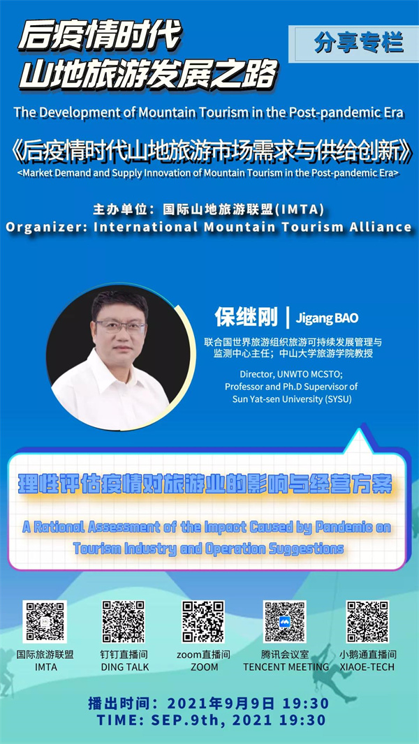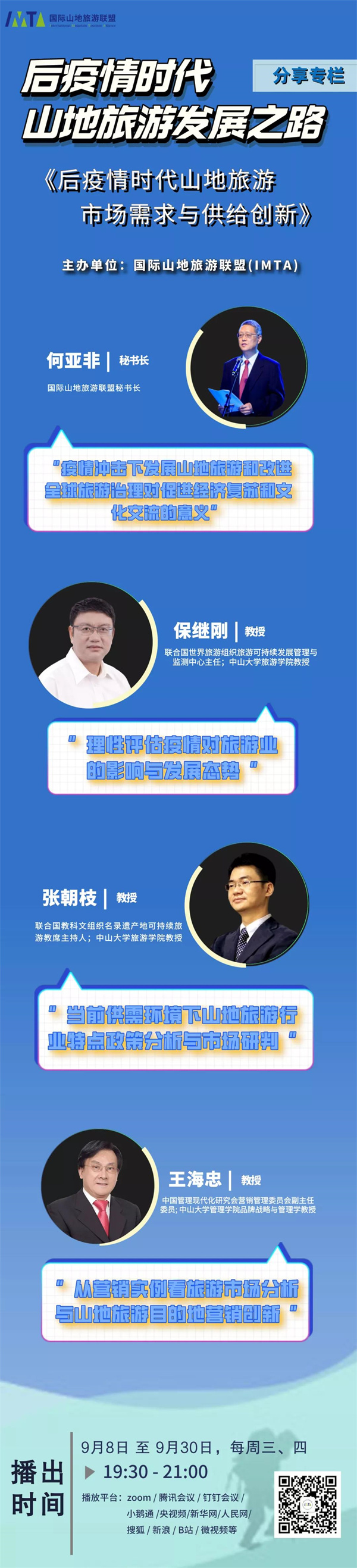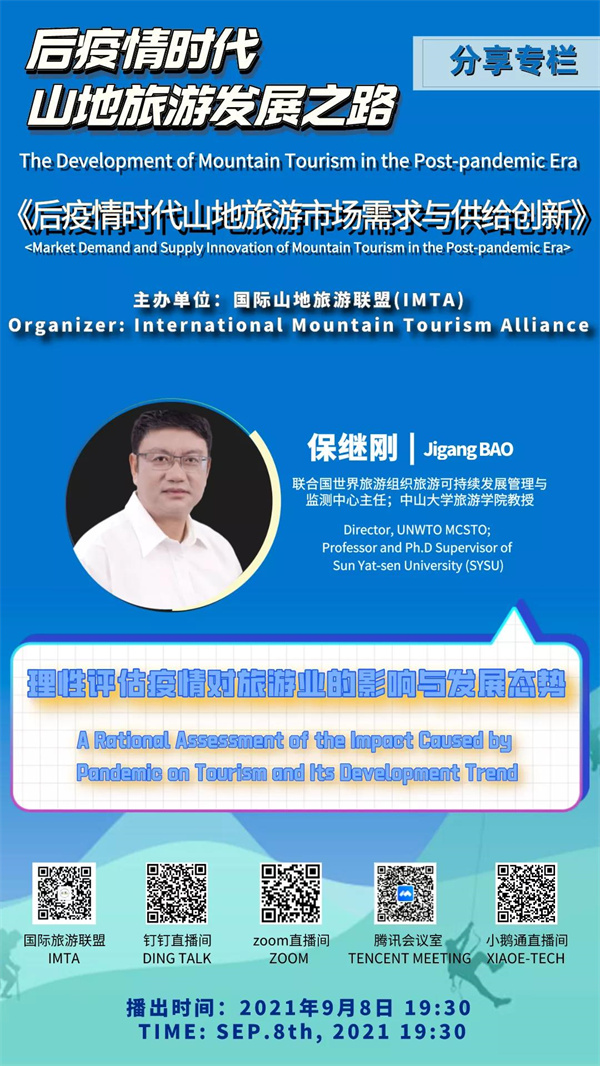 国际山地旅游联盟本着“保护山地资源、传承山地文明、促进山地经济、造福山地民众”的宗旨,针对当前疫情挥之不去、世界旅游业持续低迷的情况,创办了“后疫情时代山地旅游发展之路”分享专栏。第一期以“后疫情时代山地旅游市场需求与供给创新”为题,邀请世界旅游组织、教科文组织等权威机构的旅游专家,以视频直播形式对山地旅游发展利好政策、市场机遇、行业需求、项目提升和营运技巧进行解读、分析、研判和分享。