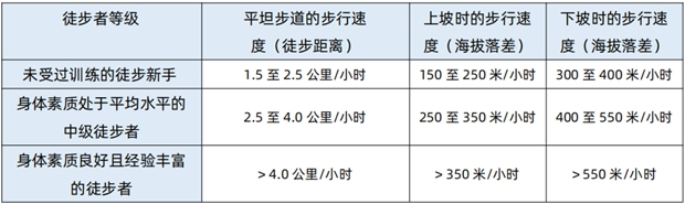 在步道沿途的布告板和信息栏上通常会标出该条步道的长度和完成这段距离的平均步行时间。所示步行时间通常是根据中等水平的成人徒步者以中等步行速度行走而计算得出的