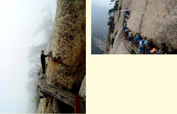 这条由人工在花岗岩山壁上生生凿出来然后用铁链固定的华山步道已有数千年的历史。这条步道数千年来一直是佛教、道教修行者和朝圣者的拜谒路线。由于大众旅游的发展及华山第一条索道的开通,这条从花岗岩壁中凿出来的步道被誉为“世界最危险”的一条徒步步道。华山修建了一些安全的新步道,并关闭了一些有安全风险的步道。一些路段还设置了缆索,确保游客能用随身携带的攀岩安全带固定。