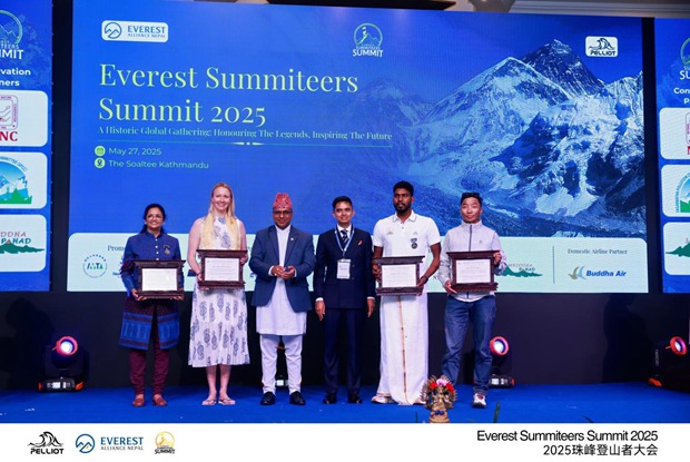 峰会特别设置历史性致敬环节,尼泊尔文化、旅游和民航部长巴德里·普拉萨德·潘迪部长为国际及尼泊尔本土珠峰登顶者颁发荣誉证书,致敬其对登山事业的贡献。1953年人类首登珠峰探险队最后在世成员坎查·夏尔巴(Kancha Sherpa)被授予“终身成就奖”。这位九旬传奇以亲身经历诠释峰会精神,历史荣光与当代攀登者在此刻完成跨世纪对话。