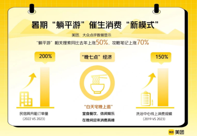 美团、大众点评数据显示,暑期以来,“躺平游”相关搜索比去年同期上涨50%,攻略笔记同比上涨70%。搜索人群中,30岁以下年轻人占比超过七成。这一新趋势也带动了洗浴中心线上消费规模较2019年增长150%、按周或月预订的民宿订单量同比去年涨超200%,并催生了“晚七点”经济,促进堂食餐饮、休闲娱乐等业态在晚间迎来全天订单最高峰。