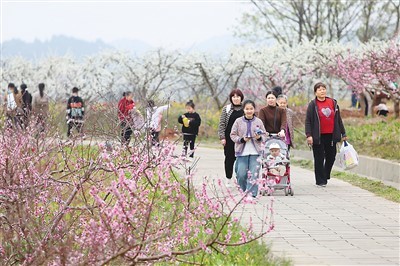 四川省绵阳市涪城区丰谷镇桃花盛开,吸引市民前来游玩。陈冬冬摄(人民图片)