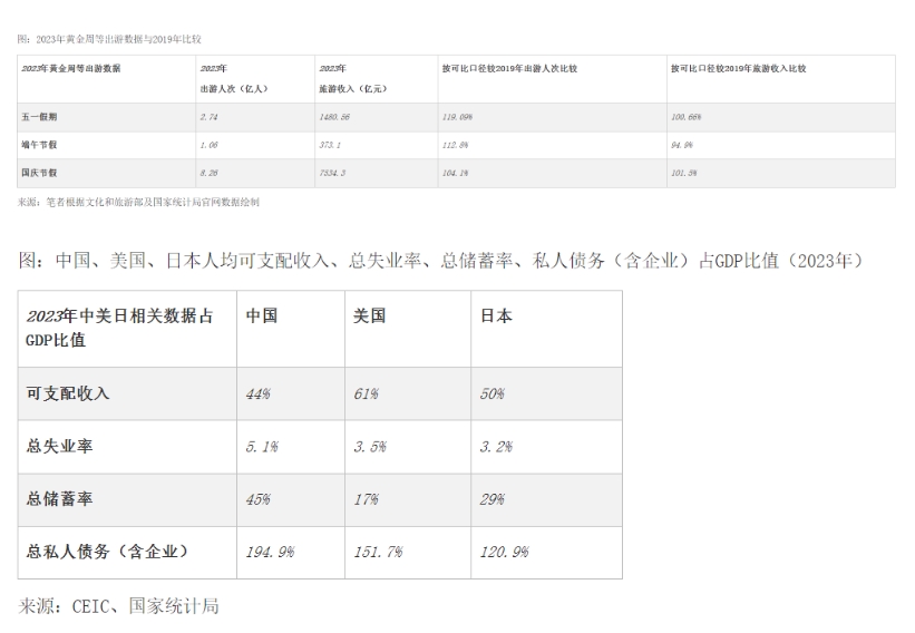 消费降级与体验升级同步存在。根据文化和旅游部数据中心数据显示,以2023年“五一”假期5天为例,国内出游合计2.74亿人次,较2019年增长19.09%;但国内旅游收入1480.56亿元,较2019年仅增长0.66%,中秋、国庆情况类似详见下表,旺丁不旺财、增人不增收现象明显。同时,根据CEIC及世界银行等数据显示,国内人均可支配收入占GDP比重远低于美日等发达国家。另外,近年来国内失业率保持在5.1%以上,高于美国、日本,因预防性储蓄等原因,国内总储蓄率持续提升至45%,私人(含企业)债务占GDP比为194.9%,均远高于美国、日本。综合来看,国内人均可支配收入占GDP比值偏低、人均出游消费降低、物质消费降级的趋势明显。