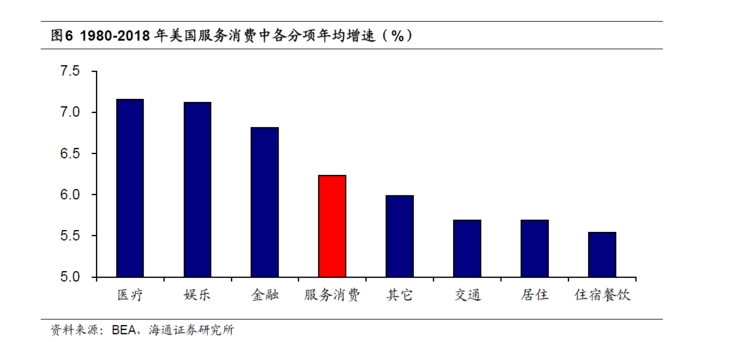 自上世纪80年代起,美国偏文化类的文旅娱乐消费常年保持7%以上的高速增长,高于偏物质类的住宿餐饮等行业,也远高于年均3-4%的GDP增速。
