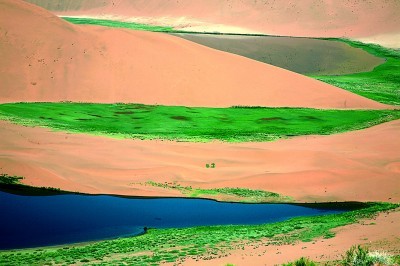 巴丹吉林沙漠里的绿色植被。哈斯巴根摄