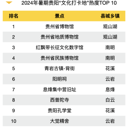 “性价比”之外,旅行者们也愈发注重旅行中对于知识和文化的“获得感”。2024年暑期,能够探索历史、学习知识的博物馆成为研学游首选目的地,各地“博物馆”搜索热度平均涨幅达64%,贵州省博物馆斩获2024暑期贵阳文化打卡地热度榜Top1。