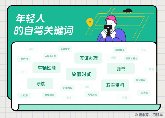 作为全球自驾游平台,租租车通过对年轻人海内外自驾游目的地的搜索、浏览、互动、分享、预订等数据综合分析,解读年轻人全球自驾旅行新趋势,为旅游目的地营销,以及旅行产品的玩法创新提供灵感。