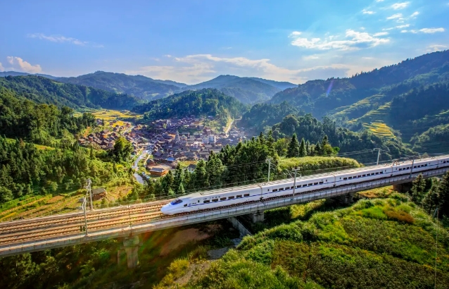 贵广高铁一列和谐号动车穿越在从江县往侗镇朝利侗乡境内