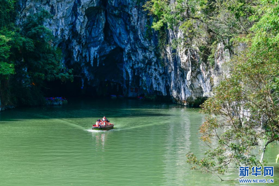 11月14日,游客在贵州省安顺市黄果树旅游区龙宫景区乘船观光