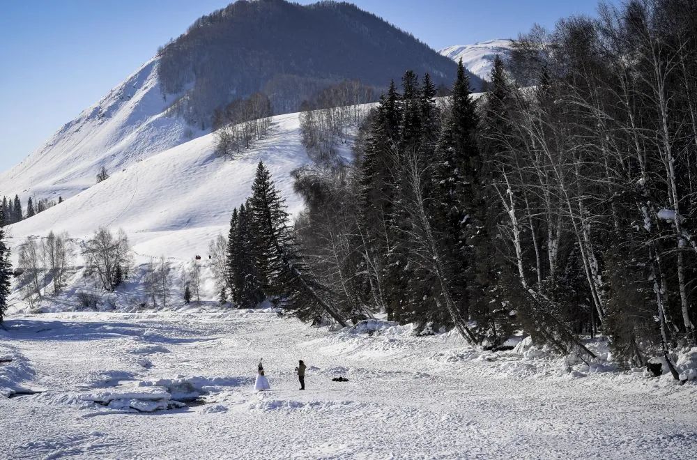2024年2月5日,两名游客在新疆阿勒泰地区布尔津县禾木村拍照。新华社记者 马锴/摄